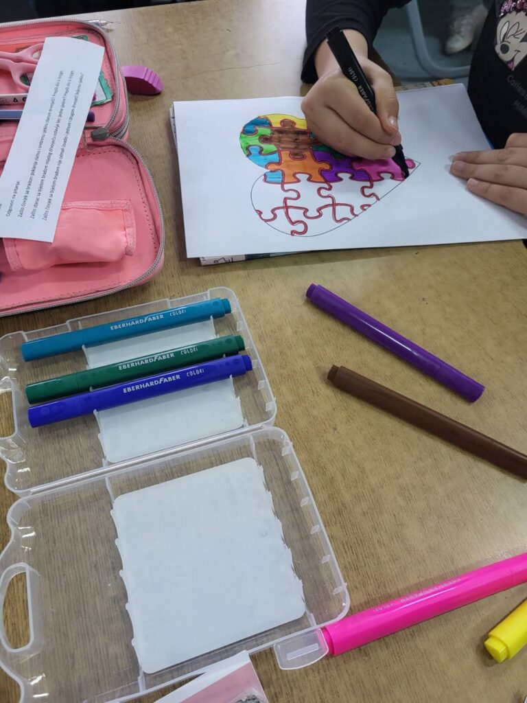 Razgovarali smo o tome koliko su sve osobe posebne i vrijedne, bez obzira na razlike. Obojili smo šarene čarape kao znak podrške i prihvatanja. Naučili smo da trebamo biti ljubazni, pomagati drugima i poštovati svakoga. Bilo nam je lijepo i naučili smo važnu poruku o prijateljstvu i jednakosti. 💙