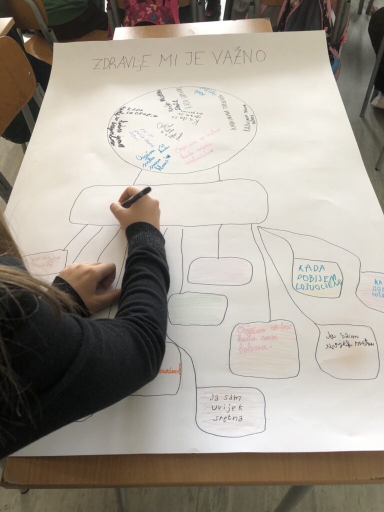 Učenici su s velikim interesom sudjelovali u zadacima poput „Memory zdravlja“, „Putovanja balonom“ i aktivnosti „To mogu uraditi“, u kojima su promišljali o svakodnevnim navikama i načinima kako ih mogu poboljšati. Na kraju radionice izrađen je i pano s porukama o zdravlju, koji će krasiti učionički prostor kao podsjetnik na važnost zdravih životnih izbora.